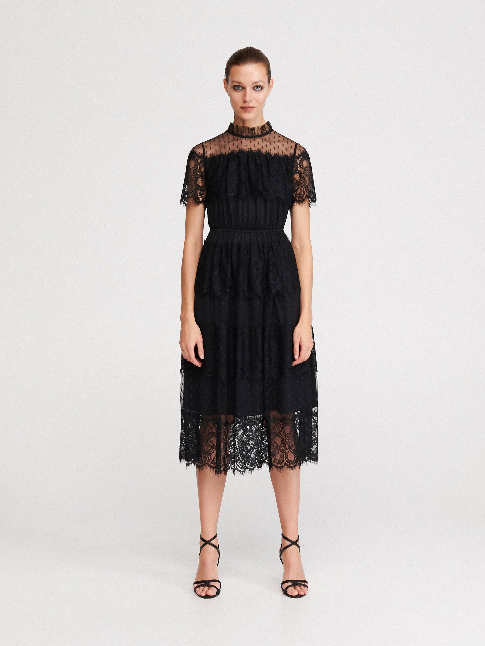 Елена не первый раз «выгуливает» черное платье, облачаясь в кружево ради особенного повода. Пожалуй, такая вещица не помешает в гардеробе — особенно учитывая полезность модели для проблемных фигур и ее уместность в зимнее время. Делимся находками, похожими на выбор Захаровой!