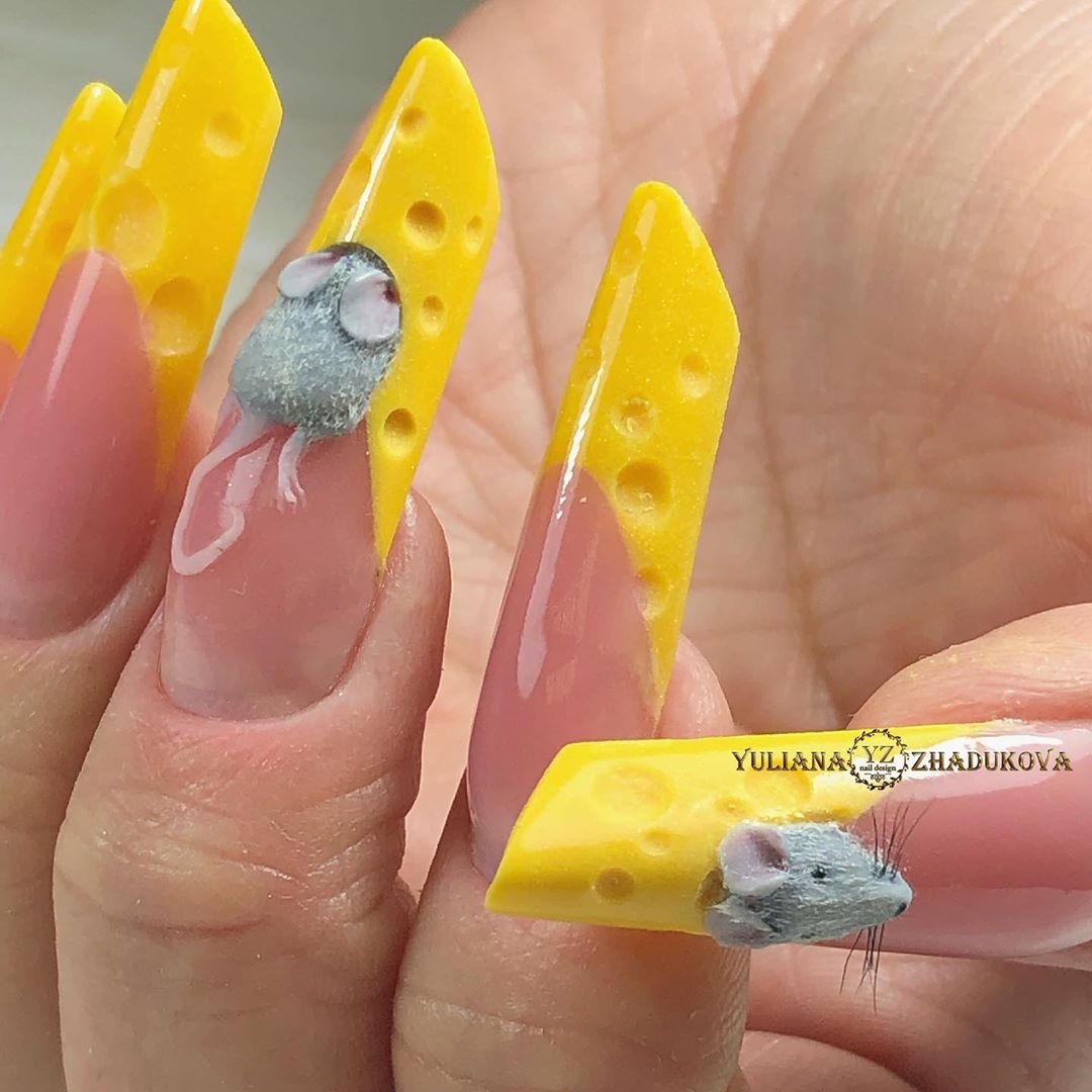 Символ наступающего года — Крыса — уже на ногтях жительниц вашего горда. Не мудрствуя лукаво, барышни заказывают у nail-мастеров рисунок грызуна — да побольше, позаметнее. И чтоб сиял: зверек же любит все с блеском! В ход идут втирки, глиттер, дополнительные наклейки и узоры, но жажда выделиться приводит к обратному эффекту — безвкусному и странному маникюру.