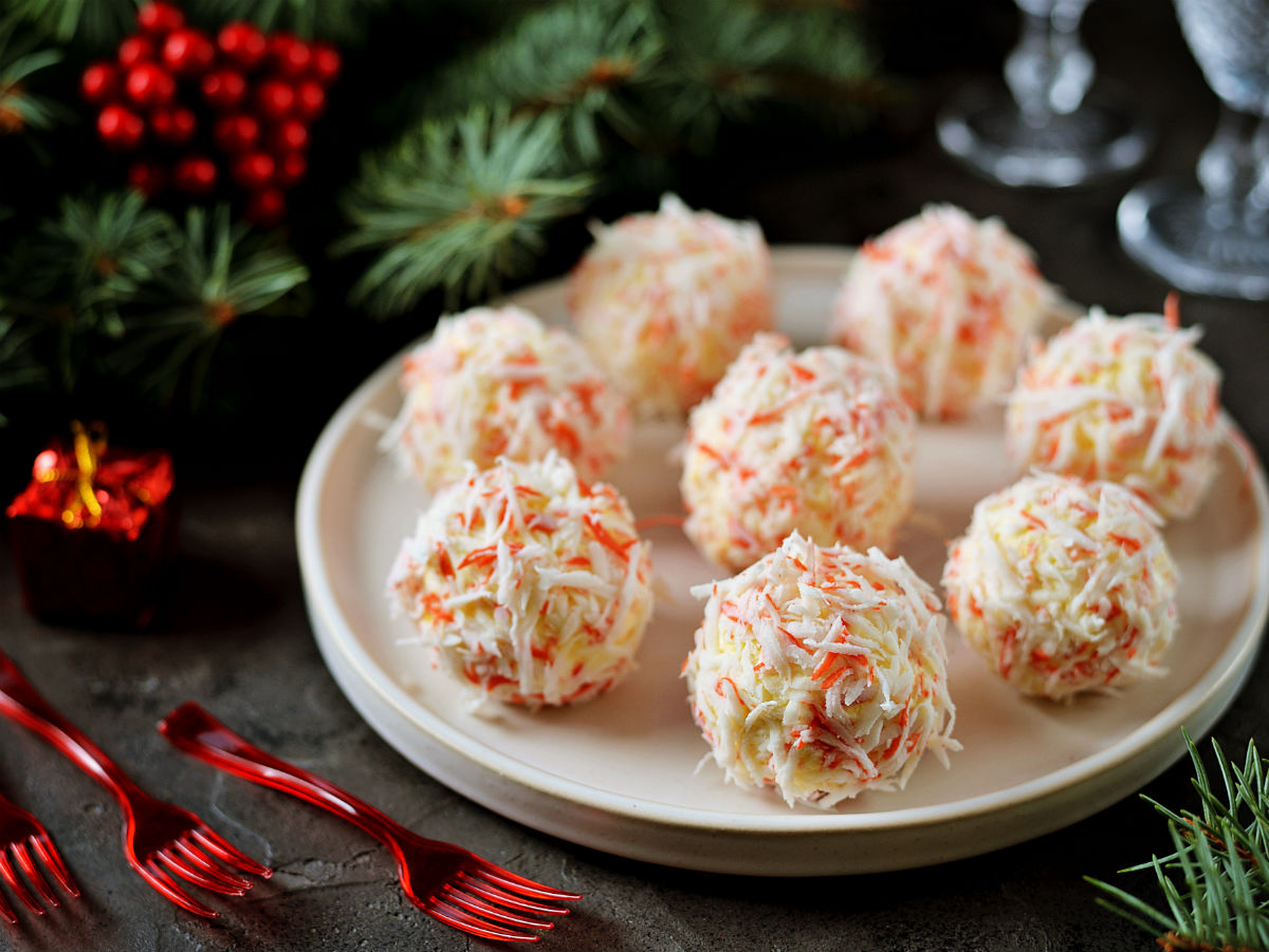 Шарики из сыра и крабовых палочек не только внешне напоминают популярные кокосовые конфеты. Внутри – такой же «орешек», только с пряным вкусом.