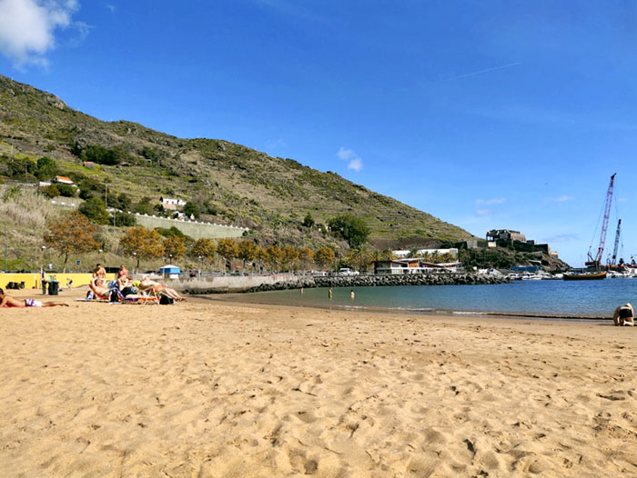 На острове есть несколько пляжей с желтым песком, привезенным из Марокко. Причем им засыпан не только берег, но и дно. Пляж представляет собой бухточку, заход в воду постепенный. Бесплатные кабинки для переодевания, душ, трейлеры с разной выпечкой - от обсыпанных сахаром жареных чуррос (около 2 евро за 6 палочек) до ароматных болу ду каку.