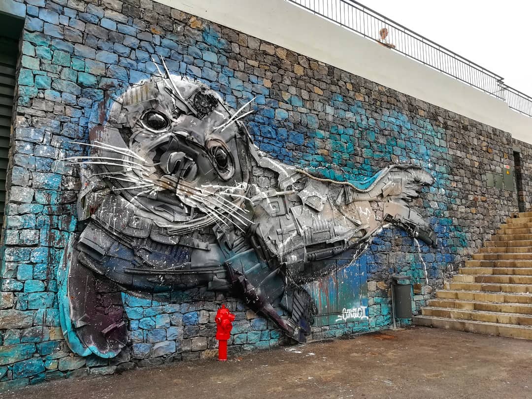 Экополотно из разного хлама: провода, пластиковые каски, тряпки… Намекает на то, что надо беречь окружающий мир и морских существ, не засорять водоемы. Тюлень украшает стену в бухте рыбацкой деревни Камара-ди-Лобуш, куда в 1950 году приехал подлечить астму Черчилль. Местные красоты его так вдохновили, что он взялся за кисть и мольберт. В память о визите премьер-министра Великобритании установлены табличка и он сам в бронзе - перед входом в отель, где жил. Сейчас ночь на двоих в Pestana Churchill Bay стоит 7500 руб.
