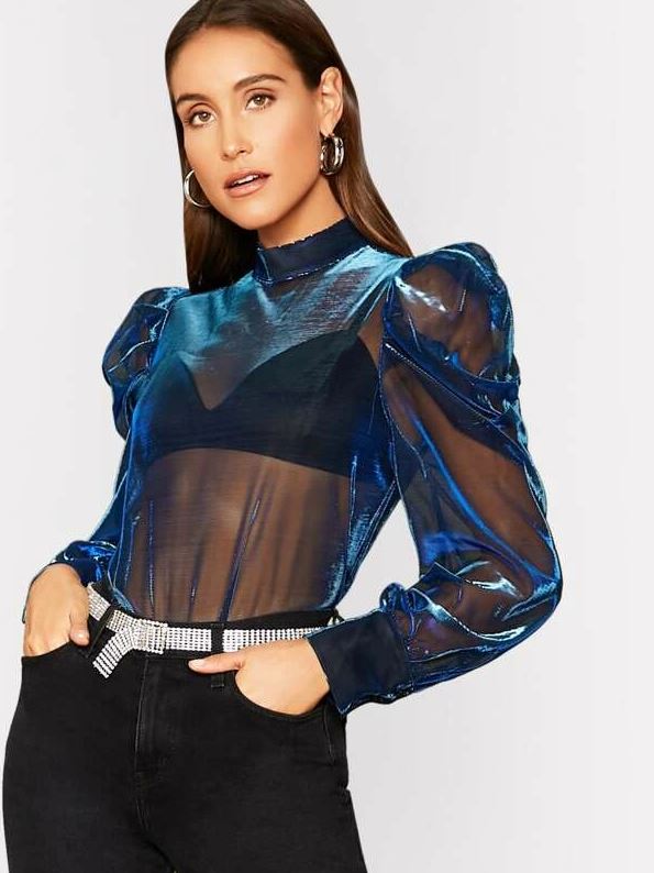 Брючный костюм в мужском стиле привлекает внимание тонко продуманными деталями. Мне нравится сочетание оттенков синего и фиолетового, а также завораживающая игра фактур: матовые брюки, блестящий жакет, атласные лацканы и прозрачная блузка. Этих нюансов было бы достаточно для создания женственного, но при этом сексуального образа.