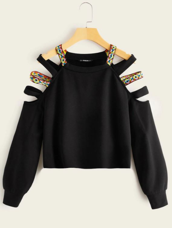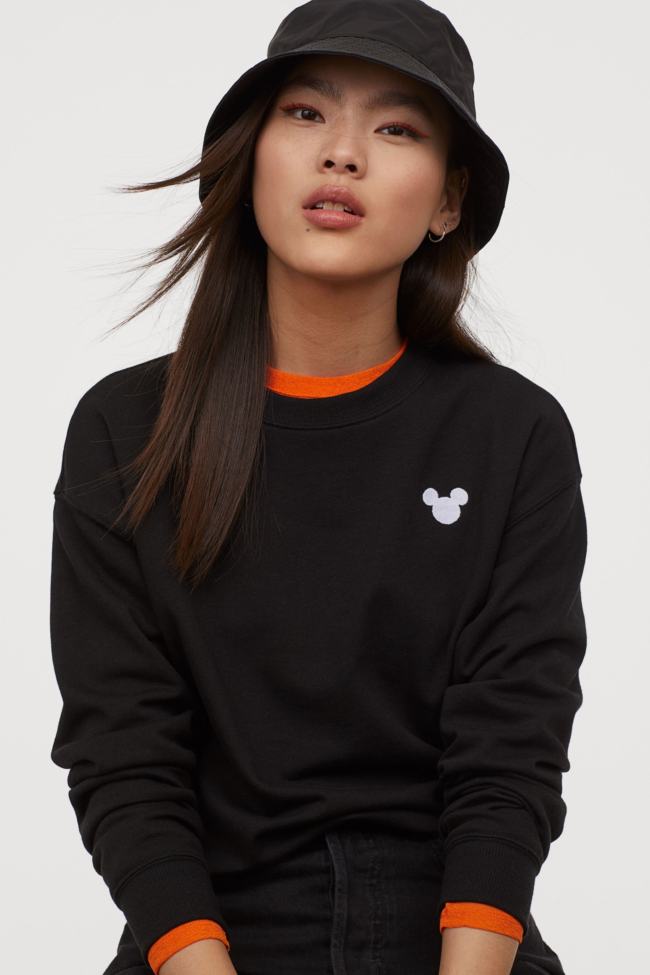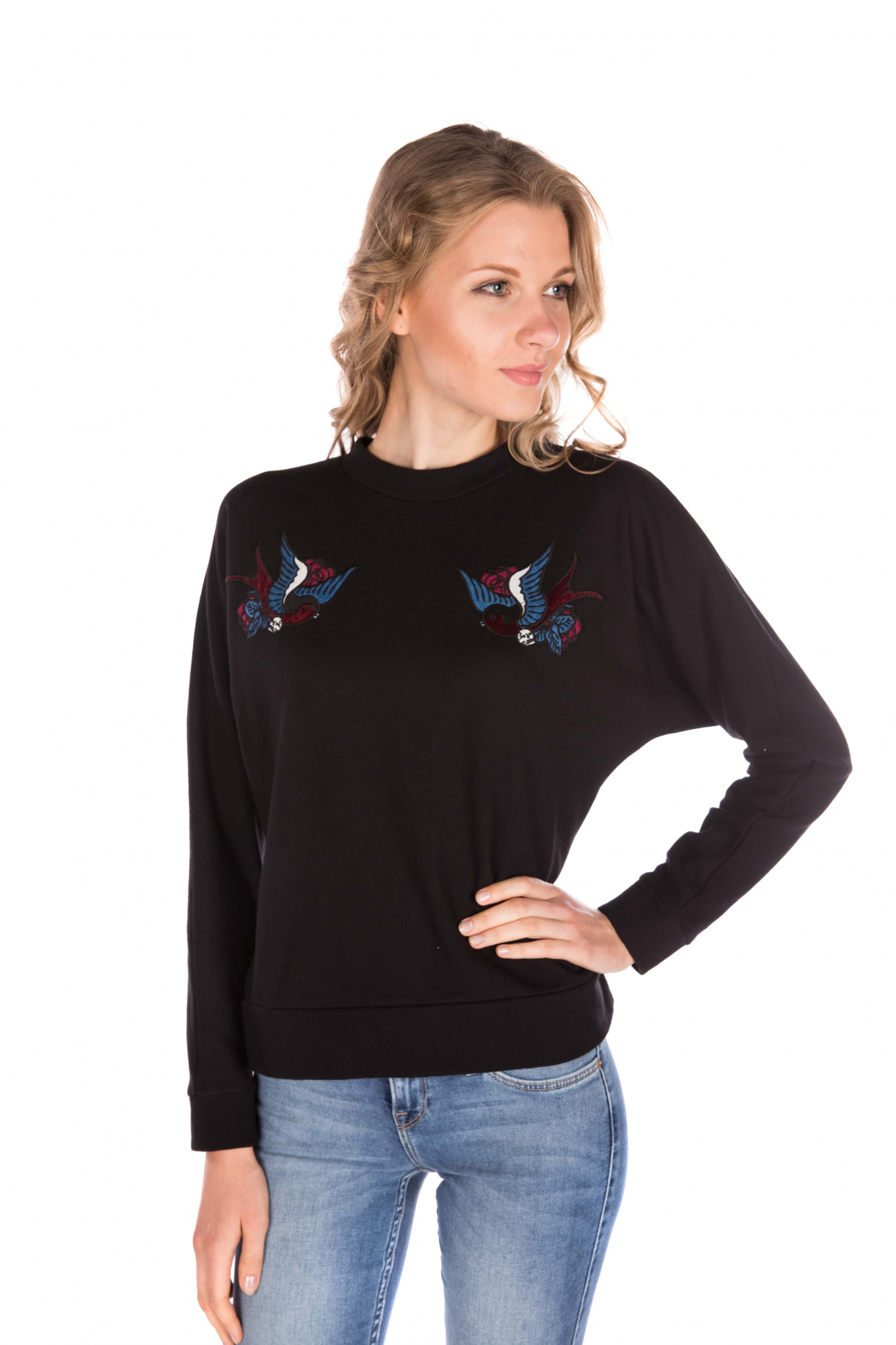 Стилист лосины со смайлами не запретил — но пару к ним стоит подобрать поспокойнее. Черный свитшот с небольшим декором подойдет к образу в стиле Наташи Королевой. Да и в гардеробе не потеряется, выручая в случае прогулки, дружеской встречи или пикника.
