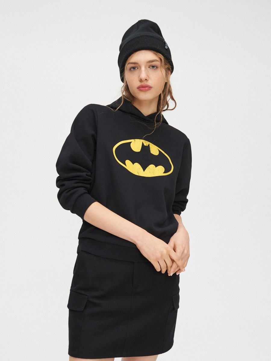 Должно быть что-то одно. Если оставляем верх, то подбираем к нему однотонные леггинсы с актуальными сейчас сникерсами на белой контрастной подошве. Если солирует низ с рисунком, то ему в пару лучше выбрать максимально лаконичную кофту: подойдет тот же черный без принта, может, с небольшой надписью. Тогда лук будет смотреться сбалансированно.