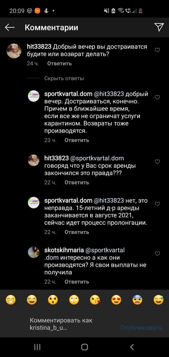 Марину кормили завтраками до 24 июля, затем сообщили о дне открытия еще «через неделю», «через 12 дней»… Первого августа в аккаунте «Спортквартала» объявили, что клуб получил директиву от властей города относительно продолжения карантина. Поэтому вопрос со сроками открытия продолжает решаться, и вообще — целесообразнее уже завершить все ремонтные работы и открыться в декабре 2020 года. То есть — спустя больше года после продажи абонемента!