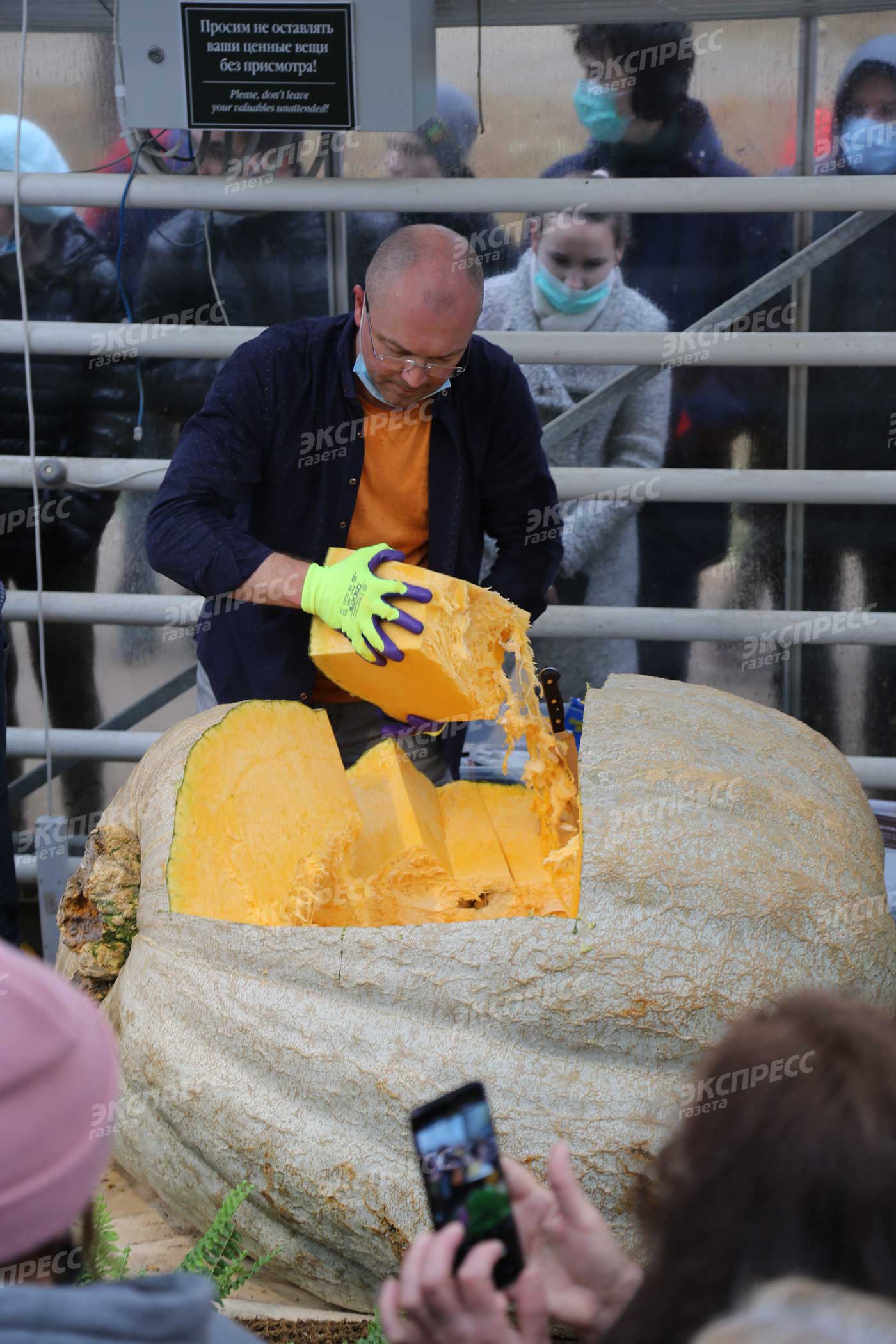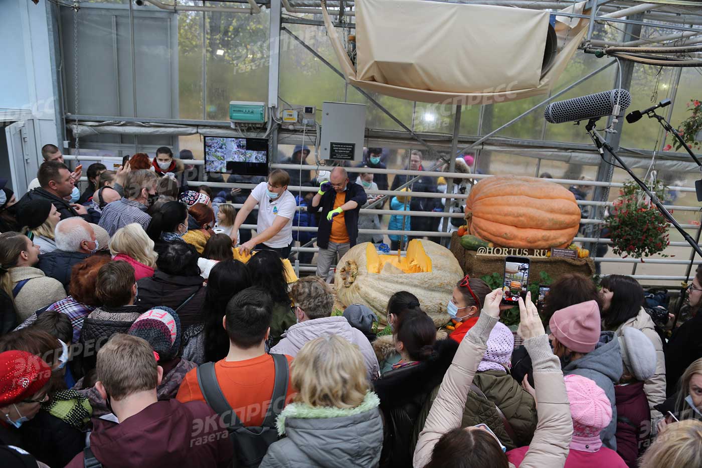 В воскресенье, 1 ноября, в старейшем ботаническом саду России, «Аптекарском огороде» МГУ, состоялось торжественное вскрытие гигантской тыквы весом 390 килограмм. Мякоть раздали всем желающим. А их собралось немало: очередь перед входом в оранжерею растянулась на десятки метров.